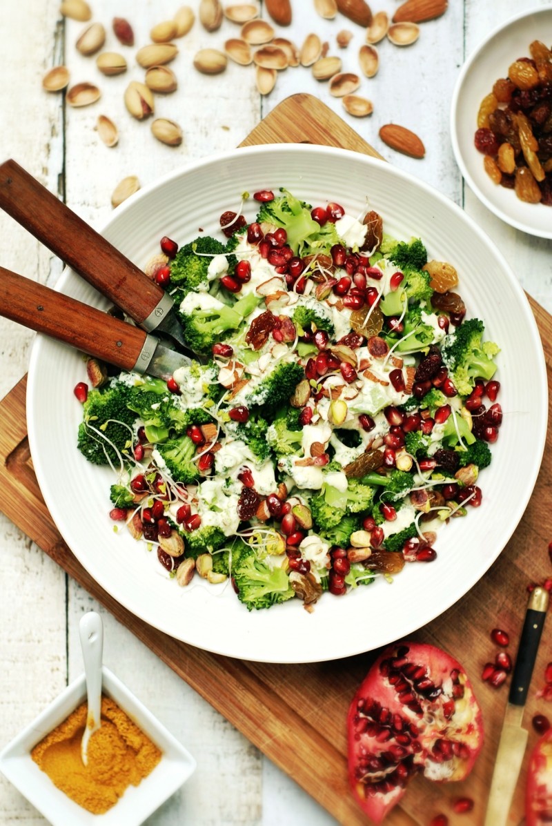 Brokuły z sosem curry i owocem granatu