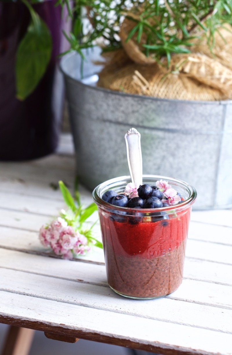 Kakaowy pudding chia z musem truskawkowym, awokado i borówkami