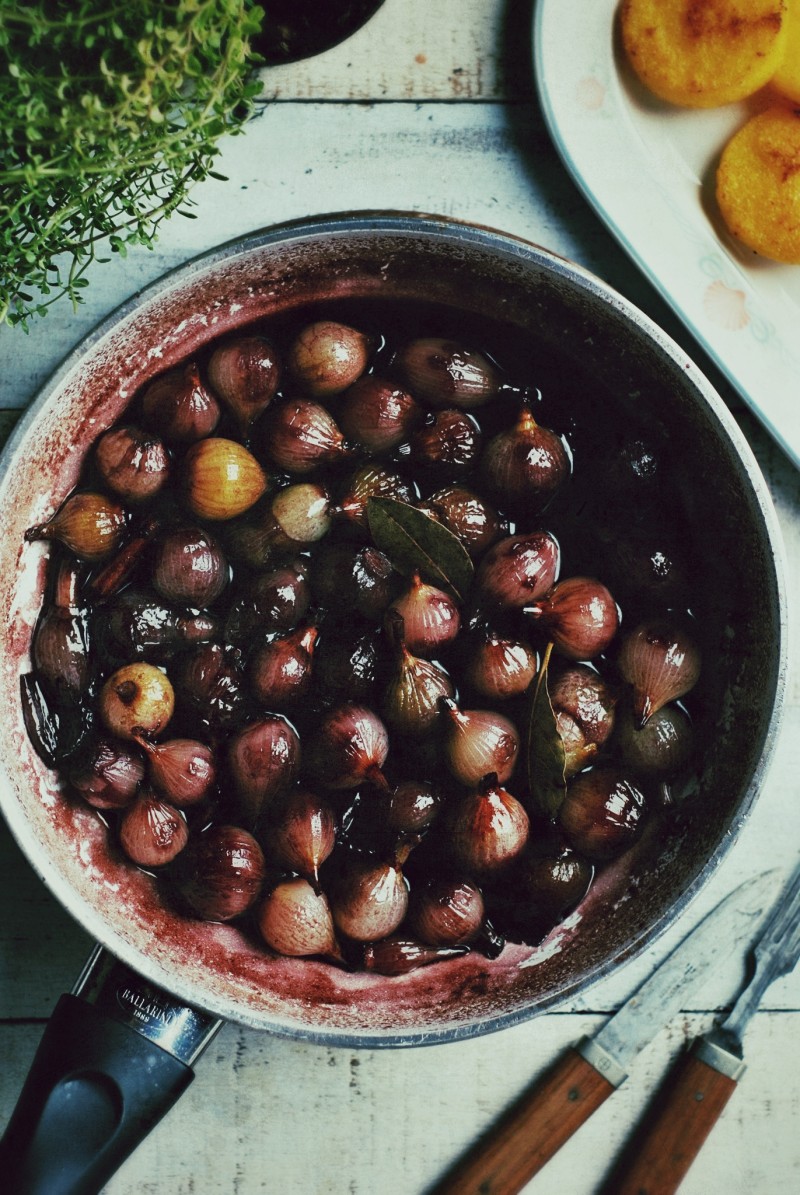 Cebulki w czerwonym winie z polentą
