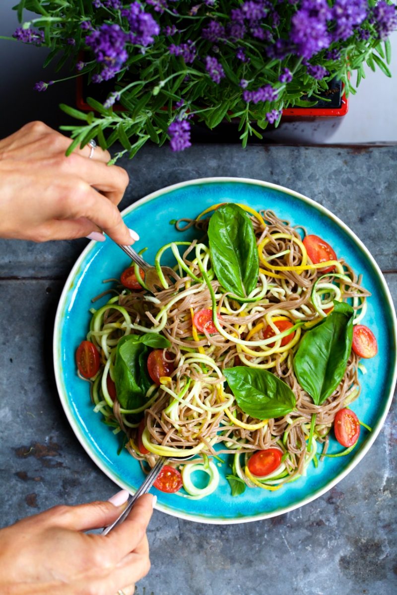 Makaron gryczany z pesto, cukinią i pomidorkami