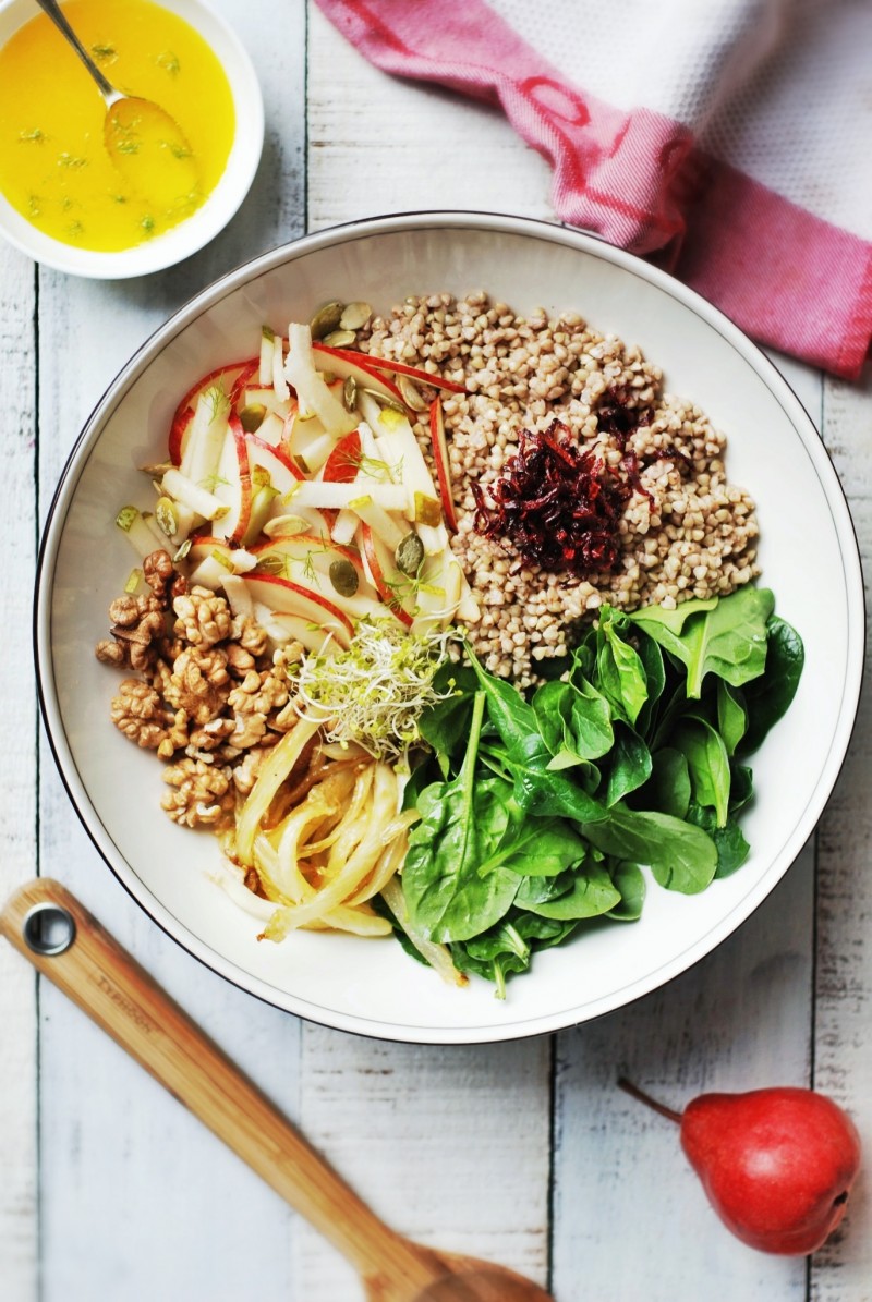 Sałatka z kaszą gryczaną, szpinakiem i fenkułem